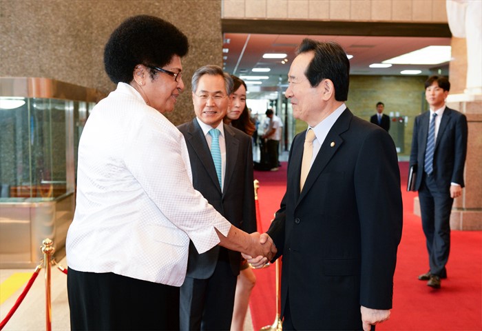 (서울=포커스뉴스) 정세균(오른쪽) 국회의장이 26일 오전 서울 여의도 국회에서 지코 루베니(Jiko LUVENI) 피지 국회의장을 접견, 인사하고 있다. <사진제공=국회>