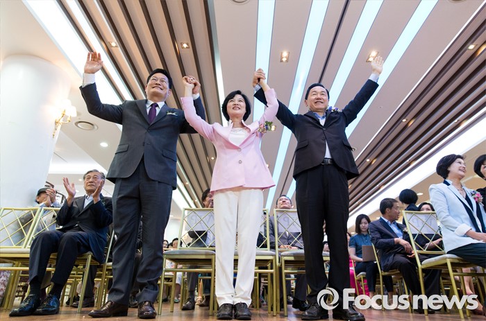 (서울=포커스뉴스) 26일 오후 서울 서초구 엘루체에서 열린 더불어민주당 서울특별시당 서초갑 정기지역대의원대회에서 전당대회 출마를 선언한 송영길(왼쪽부터) 의원과 추미애 의원, 김상곤 의원이 만세삼창을 하고 있다.