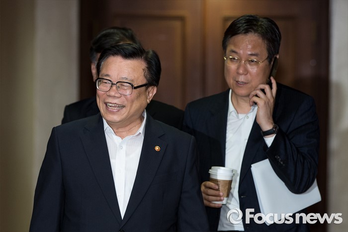 (서울=포커스뉴스) 이동필(왼쪽) 농림축산식품부 장관이 27일 오전 서울 세종로 정부서울청사에서 열린 경제관계장관회의에 참석하고 있다.