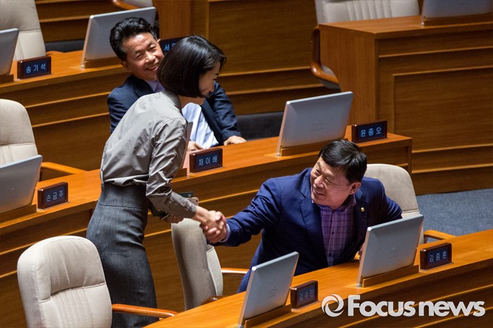 (서울=포커스뉴스) 김수민(왼쪽) 국민의당 의원과 김종훈 무소속 의원이 27일 오후 서울 여의도 국회에서 열린 344회 국회(임시회) 3차 본회의에 참석해 악수 하고 있다.