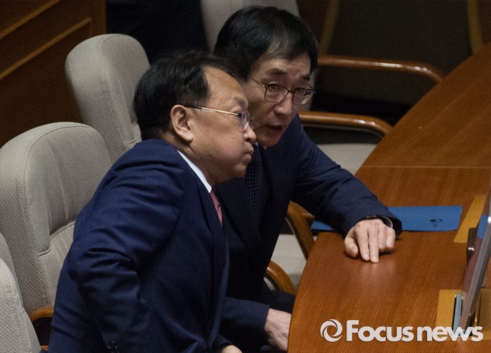 (서울=포커스뉴스) 27일 오후 서울 여의도 국회에서 열린 344회 국회(임시회) 3차 본회의에 참석한 유일호(왼쪽) 경제부총리 겸 기획재정부 장관과 이준식 사회부총리 겸 교육부 장관이 대화하고 있다.