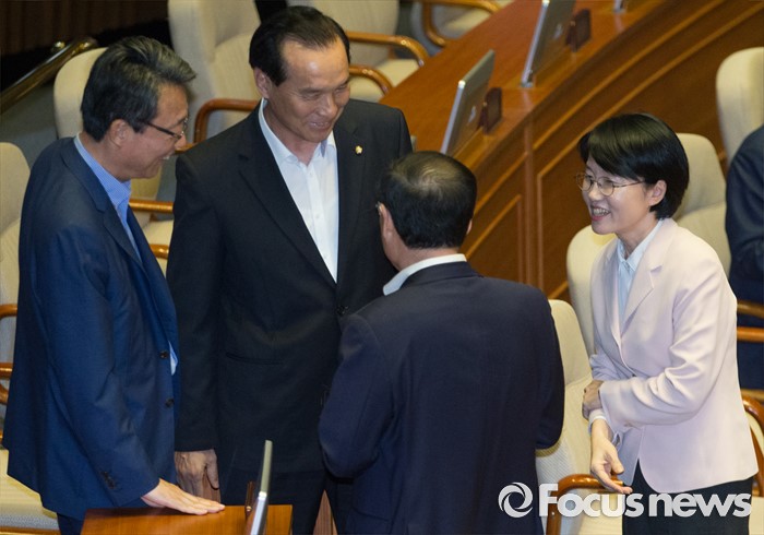 (서울=포커스뉴스) 27일 오후 서울 여의도 국회에서 열린 344회 국회(임시회) 3차 본회의에 참석한 박선숙 국민의당 의원이 김성식 정책위의장 등 동료 의원들과 대화하고 있다.