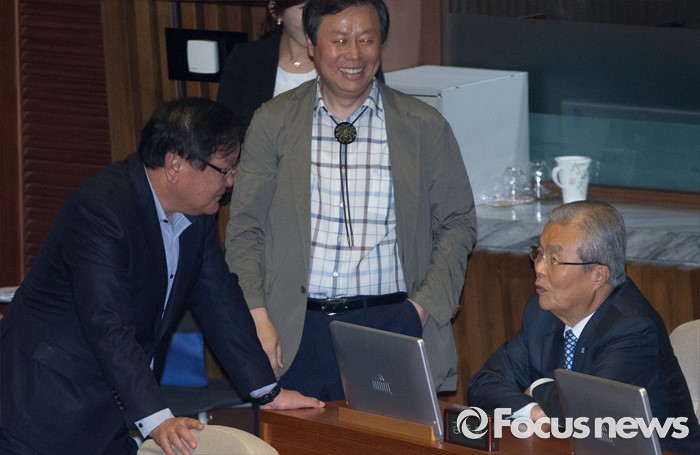 (서울=포커스뉴스) 27일 오후 서울 여의도 국회에서 열린 344회 국회(임시회) 3차 본회의에 참석한 김종인(오른쪽부터) 더불어민주당 비대위 대표, 도종환, 김태년 의원이 대화하고 있다.