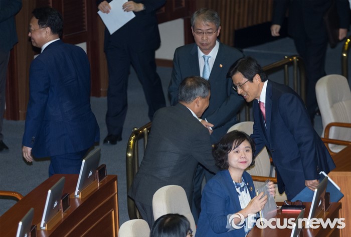 (서울=포커스뉴스) 27일 오후 서울 여의도 국회에서 열린 344회 국회(임시회) 3차 본회의에 참석한 황교안 국무총리가 추경 시정연설을 마친 뒤 의원들과 인사하며 퇴장하고 있다.