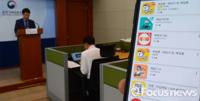 (세종=포커스뉴스) 28일 오전 세종시 정부세종청사 공정거래위원회에서 김문식 전자거래과장이 6개 배달앱 사업자의 전상법 위반행위 시정조치에 대한 브리핑을 하고 있다. 핸드폰 화면은 배달앱 검색시 노출순.