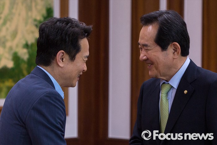 (서울=포커스뉴스) 정세균(오른쪽) 국회의장과 남경필 경기도지사가 28일 오후 서울 여의도 국회 의장접견실에서 회동에 앞서 인사 하고 있다.