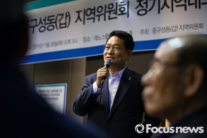 (서울=포커스뉴스) 더불어민주당 송영길 의원이 28일 오후 서울 성동구 레노스블랑쉬 웨딩홀에서 열린 서울 중구·성동갑 지역대의원대회에서 발언하고 있다.