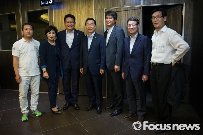 (서울=포커스뉴스) 더불어민주당 송영길(왼쪽 세 번째) 의원과 김상곤(왼쪽 네 번째) 전 혁신위원장이 28일 오후 서울 성동구 레노스블랑쉬 웨딩홀에서 열린 서울 중구·성동갑 지역대의원대회에서 참석자들과 기념사진을 찍고 있다.