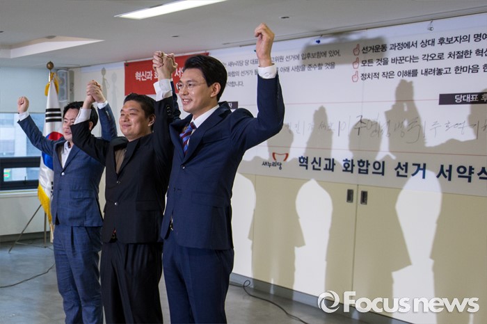 (서울=포커스뉴스) 새누리당 전당대회 청년최고위원 후보들이 9일 오전 서울 여의도 새누리당사에서 열린 '4차 전당대회 혁신과 화합의 선거 서약식'에 참석해 사진촬영을 하고 있다. 왼쪽부터 이부형, 이용원, 유창수 후보.
