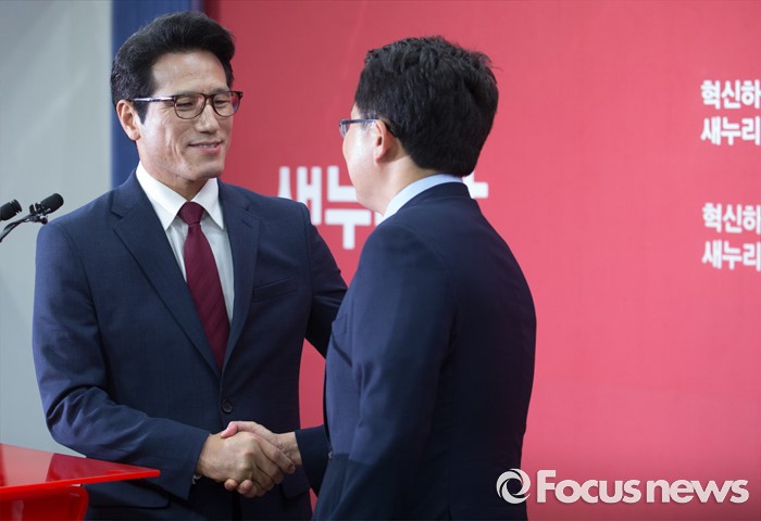 (서울=포커스뉴스) 전당대회 대표최고위원 출마를 선언한 정병국(왼쪽), 김용태 새누리당 의원이 29일 오후 서울 여의도 당사에서 단일화 발표 중 악수하고 있다. 이날 두 의원은 여론조사를 통해 정병국 의원으로 단일화를 결정했다.
