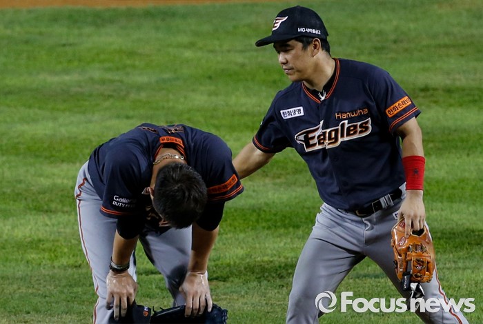 (서울=포커스뉴스) 29일 서울 잠실구장에서 열린 2016 프로야구 한화-두산 경기 연장 11회말 한화 투수 권혁이 승리를 결정지은 후 정근우의 격려를 받고 있다.
