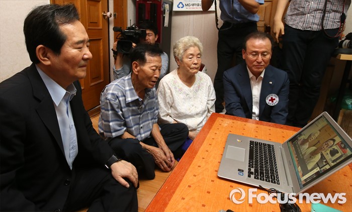 (서울=포커스뉴스) 정세균 국회의장이 2일 오전 서울 종로구 창신동에 거주하고 있는 고령 이산가족 김문각 할아버지(84세, 평안남도 양덕군 청계리) 가정을 방문해 김 할아버지, 아내 이오례 할머니가 만든 영상편지를 시청하고 있다.