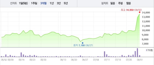 이는 2주 전 주가인 7월19일(9070원)과 비교했을 때 49.39% 상승한 수치다.