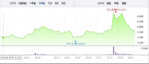 이는 일주일 전 주가인 7월27일(4780원)과 비교했을 때 21.33% 떨어진 수치다.