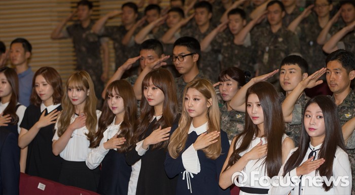 (서울=포커스뉴스) 2일 오전 서울 용산구 국방부에서 열린 '군인 금연 홍보 엔젤스 위촉식'에서 금연 홍보대사로 위촉된 그룹 러블리즈가 국민의례를 하고 있다.