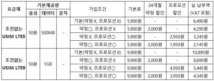 최저가 LTE 유심요금제인 조건없는 유심 LTE 5는 LTE폰을 가지고 있으면서, 사용량은 적은 고객에게 인기를 끌 것으로 기대된다. 24개월 약정시 기본료 3900원(부가세 별도)에 음성통화 50분, 데이터 500MB를 이용할 수 있다.