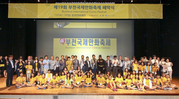 박재동 축제운영위원장은 "짧고도 긴 5일의 만화축제가 이제 막을 내린다. 20회를 바라보는 내년 만화축제는 명실공히 세계적인 축제로 거듭날 수 있도록 할 예정이다. 더 많은 세계 각국 만화관계자와 관람객이 찾고, 더 많은 만화 작품을 소개하고, 널리 알릴 수 있도록 축제의 장을 넓히기 위해 노력하겠다"고 전했다.제19회 부천국제만화축제 폐막식 기념사진.<사진제공=한국만화영상진흥원>제19회 부천국제만화축제 '코스튬 플레이어 최강자전'에서 대상을 수상한 '더 에이(The A)'팀 우승 기념사진.<사진제공=한국만화영상진흥원>제19회 부천국제만화축제 현장 전경 자료사진. <사진제공=한국만화영상진흥원>'윤태호 특별전-삶의 고고학'에 참석한 윤태호 작가 사진. <사진제공=한국만화영상진흥원>제19회 부천국제만화축제 '코스튬 플레이어 최강자전'서 참석한 코스튬 플레이어 단체사진. <사진제공=한국만화영상진흥원>