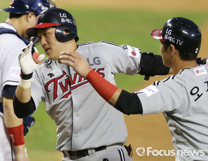 (서울=포커스뉴스) 3일 서울 잠실구장에서 열린 2016 프로야구 LG-두산 경기 4회초 무사 3루에서 LG 양석환이 좌월 2점 홈런을 날리고 선행주자 오지환의 환영을 받으며 홈인하고 있다.