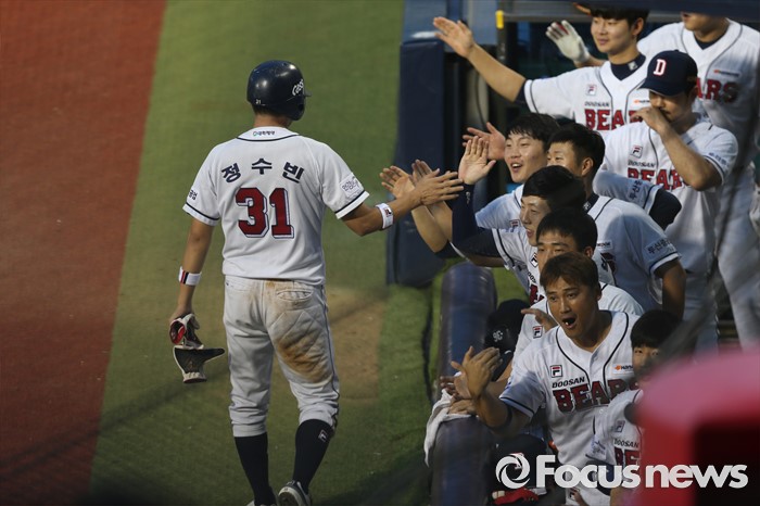 (서울=포커스뉴스) 2일 오후 서울 잠실구장에서 열린 2016 프로야구 LG-두산 경기 3회말 1사 만루 상황, LG 투수 허프의 폭투로 3루 주자 정수빈이 홈으로 진루해 세이프 한 뒤 더그 아웃에서 선수들과 하이파이브를 하고 있다.