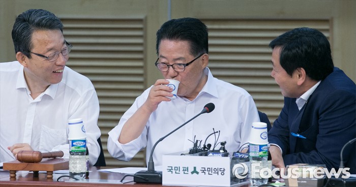 (서울=포커스뉴스) 2일 오전 서울 여의도 국회 의원회관에서 열린 국민의당 의원총회에 참석한 박지원(가운데) 비상대책위원장, 김성식(왼쪽) 정책위의장, 김관영 원내수석부대표가 대화하고 있다.