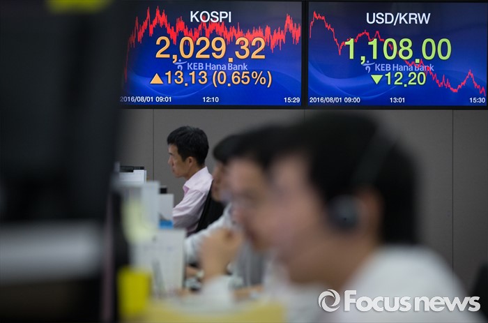 증시 매매시간이 변경된 것은 2000년 5월 점심시간(낮 12시~오후 1시) 휴장이 없어진 이후 16년만이다.(서울=포커스뉴스) 증권·파생상품 시장, 금 시장의 정규장 매매거래 시간이 30분씩 연장된 1일 오후 서울 중구 KEB외환은행 본점 딜링룸에서 딜러들이 업무를 보고 있다. 이날 코스피는 13.42(0.67%) 오른 2,029.61에 마감했으며, 원·달러 환율은 전날보다 12.2원 내린 1108.0원에 거래를 마쳤다. 2016.08.01 김흥구 기자