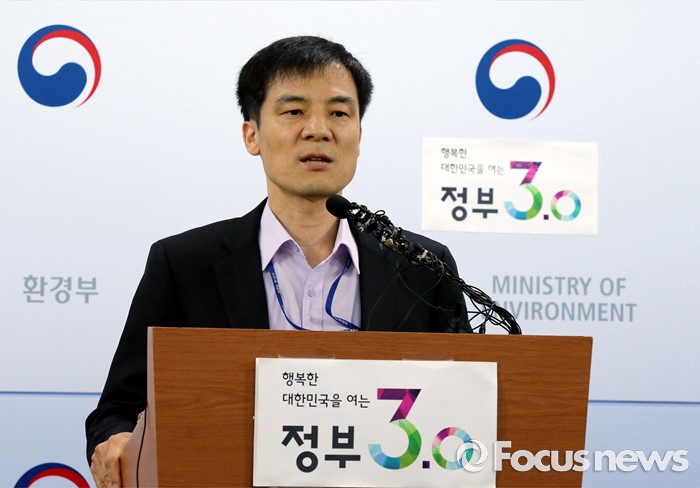 (세종=포커스뉴스) 홍동곤 환경부 교통환경과장이 2일 오전 세종시 정부세종청사 환경부 기자실에서 위조서류로 불법인증을 받은 폭스바겐 32개 차종(80개 모델)에 대해 인증취소 처분을 내렸다고 밝히고 있다.