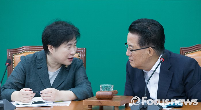 (서울=포커스뉴스) 4일 오전 서울 여의도 국회에서 열린 국민의당 원내정책회의에 참석한 박지원(오른쪽) 비상대책위원장과 신용현 의원이 대화하고 있다.