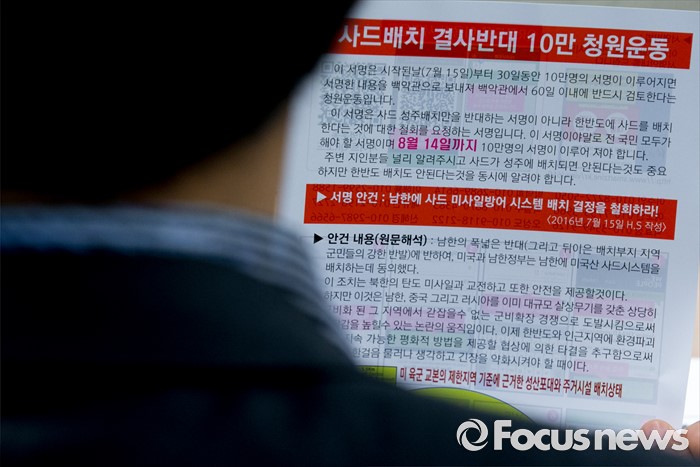 (서울=포커스뉴스) 2일 오전 서울 여의도 국회 의원회관에서 열린 국민의당 의원총회에 참석한한 의원이 사드배치 결사반대 청원운동 관련 문서를 보고 있다.
