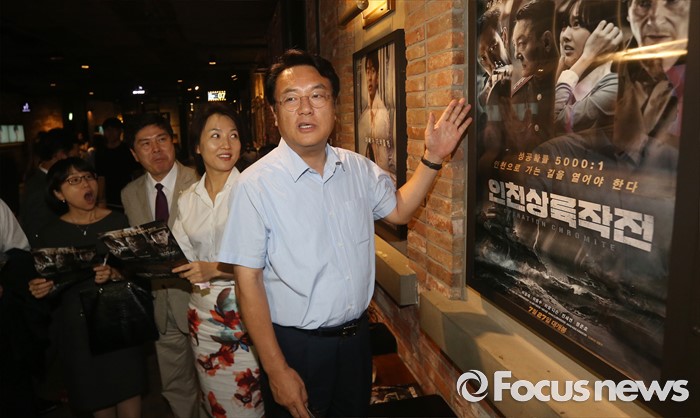 (서울=포커스뉴스) 정진석 새누리당 원내대표와 동료 의원들이 1일 오후 서울 여의도 한 영화관에서 영화 '인천상륙작전' 관람에 앞서 대화하고 있다.