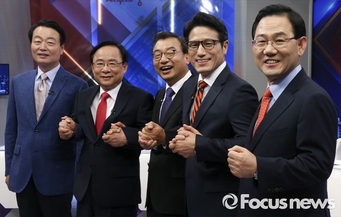 (서울=포커스뉴스) 1일 오후 서울 중구 TV조선 스튜디오에서 새누리당 대표 경선 TV토론회에 앞서 의원들이 포즈를 취하고 있다. 왼쪽부터 한선교, 이주영, 이정현, 정병국, 주호영 의원.