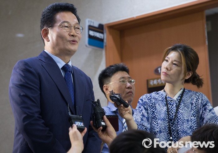 (서울=포커스뉴스) 전당대회 출마를 송영길 더불어민주당 의원이 4일 오전 서울 여의도 국회 정론관에서 공약 발표 기자회견을 마친 뒤 취재진 질문에 답하고 있다.