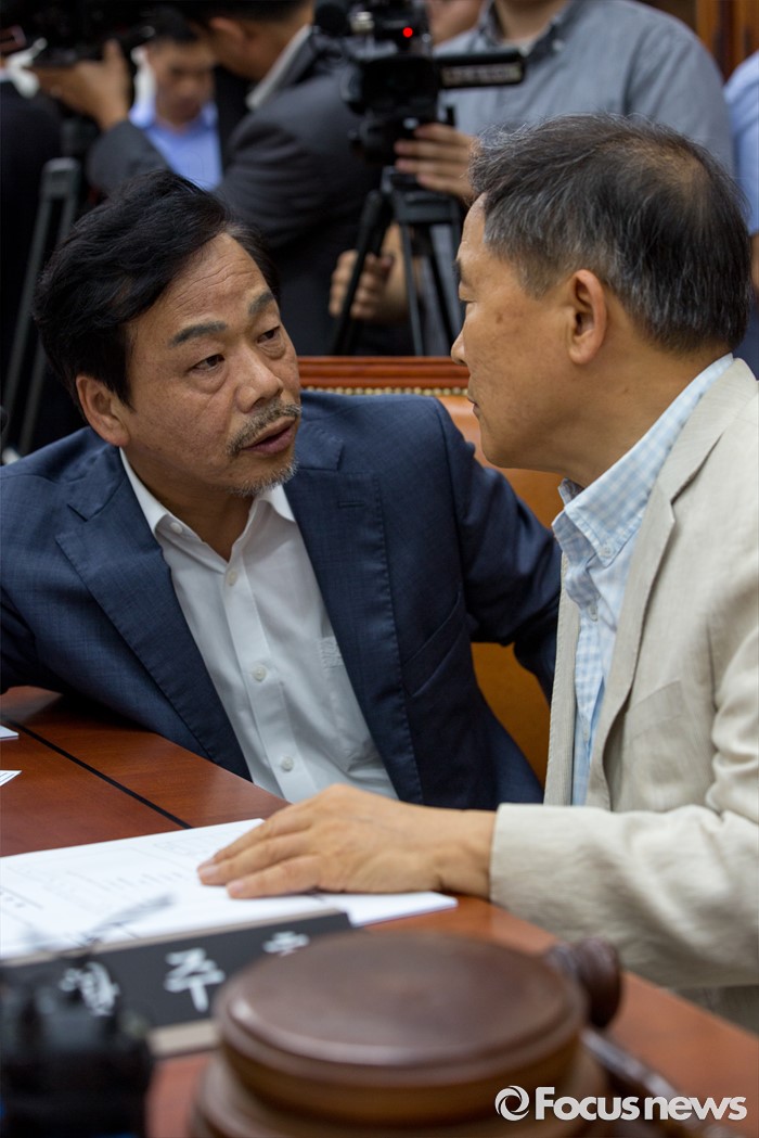(서울=포커스뉴스) 국회 농해수위 부정청탁금지법 소위 위원장인 황주홍(오른쪽) 국민의당 의원과 이완영 새누리당 의원이 4일 오후 서울 여의도 국회에서 열린 농림축산식품해양수산위원회 부정청탁금지법 관련 소위에 참석해 대화 하고 있다.