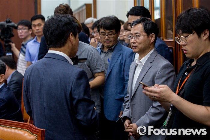 (서울=포커스뉴스) 국회 농해수위 이완영(왼쪽) 새누리당 의원이 4일 오후 서울 여의도 국회에서 열린 농림축산식품해양수산위원회 부정청탁금지법 관련 소위에 참석한 곽형석(오른쪽 두 번째) 국민권익위원회 부패방지국장과 대화 하고 있다.