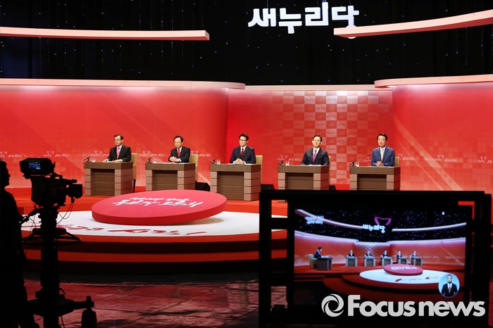 (서울=포커스뉴스) 4일 오후 서울 강서구 등촌동 SBS공개홀에서 열린 새누리당 대표 경선 4차 TV토론회에 참석한 의원들이 토론을 하고 있다. 오른쪽부터 한선교, 주호영, 정병국, 이주영, 이정현 의원.