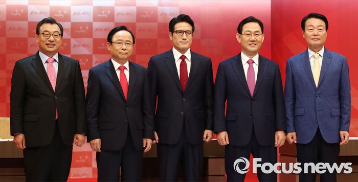 (서울=포커스뉴스) 4일 오후 서울 강서구 등촌동 SBS공개홀에서 새누리당 대표 경선 4차 TV토론회을 마친 의원들이 포즈를 취하고 있다. 오른쪽부터 한선교, 주호영, 정병국, 이주영, 이정현 의원.