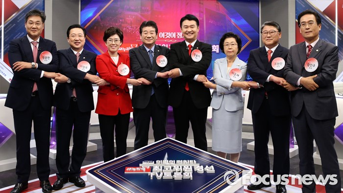 (서울=포커스뉴스) 4일 서울 중구 TV조선 스튜디오에서 열린 새누리당 최고위원 후보자 TV토론회에 참석한 의원들이 포즈를 취하고 있다. 왼쪽부터 정문헌 전 의원, 이장우, 최연혜, 강석호, 정용기, 이은재, 조원진, 함진규 의원.