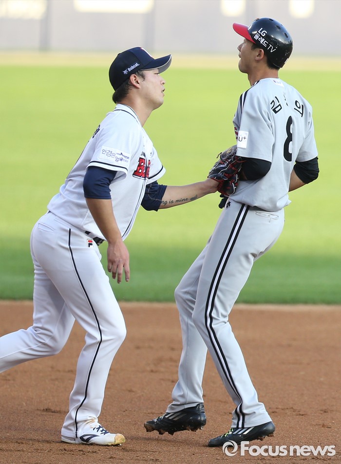(서울=포커스뉴스) 4일 서울 잠실구장에서 열린 2016 프로야구 LG-두산 경기 1회초 두산 투수 안규영의 초구를 공략해 우익수 오른쪽에 떨어지는 2루타로 진루한 LG 김용의가 이천웅의 투수앞 땅볼때 런다운에 걸려 안규영에게 태그아웃되고 있다.
