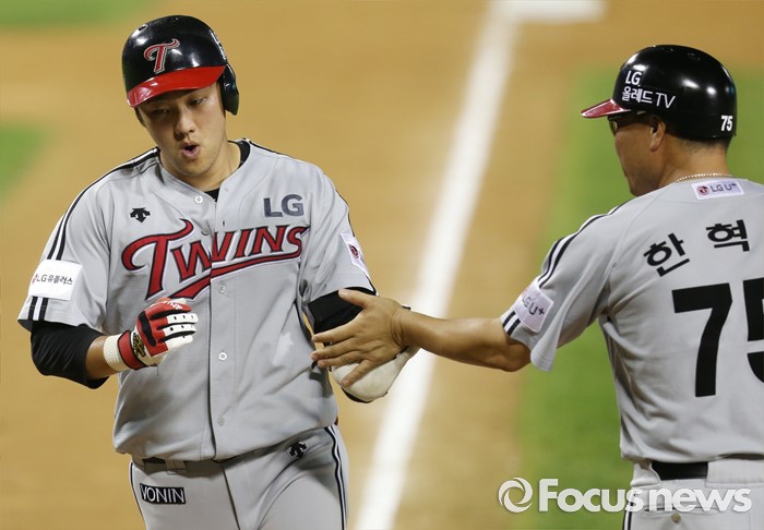 (서울=포커스뉴스) 4일 서울 잠실구장에서 열린 2016 프로야구 LG-두산 경기 8회초 1사후 LG 양석환이 중월 솔로 홈런을 치고 한혁수 코치의 환영을 받으며 홈인하고 있다.