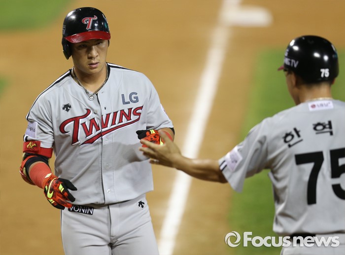 (서울=포커스뉴스) 4일 서울 잠실구장에서 열린 2016 프로야구 LG-두산 경기 연장 10회초 1사후 LG 오지환이 좌월 솔로 홈런을 치고 한혁수 코치의 환영을 받으며 홈인하고 있다.