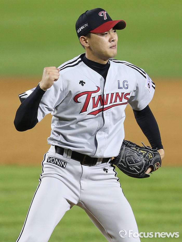 (서울=포커스뉴스) 4일 서울 잠실구장에서 열린 2016 프로야구 LG-두산 경기 9회말 2사 3루에서 LG 마무리 투수 임정우가 두산 정수빈을 스트라이크아웃낫아웃으로 잡고 실점 위기를 벗어나고 주먹을 불끈 쥐며 환호하고 있다.
