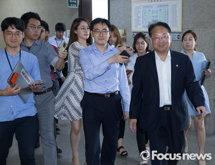 (서울=포커스뉴스) 5일 오전 서울 여의도 국회에서 추경 예산 등 협조를 위해 방문한 유일호 경제부총리 겸 기획재정부 장관이 여야 지도부를 만나기 위해 이동하고 있다.