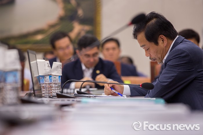 (서울=포커스뉴스) 이완영(오른쪽) 새누리당 의원이 5일 오전 서울 여의도 국회에서 열린 국회 농림축산식품해양수산위원회 전체회의에 참석해 회의 시작을 기다리며 생각에 잠겨 있다.
