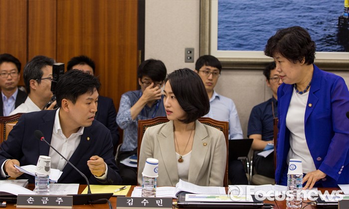 (서울=포커스뉴스) 김수민(가운데) 국민의당 의원과 손금주(왼쪽) 의원이 5일 오전 서울 여의도 국회에서 열린 산업통상자원위원회 전체회의에 참석해 대화 하고 있다.