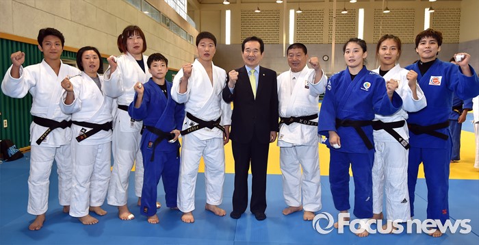 | △ 유도 국가대표 선수들과 파이팅 외치는 정세균 국회의장 |