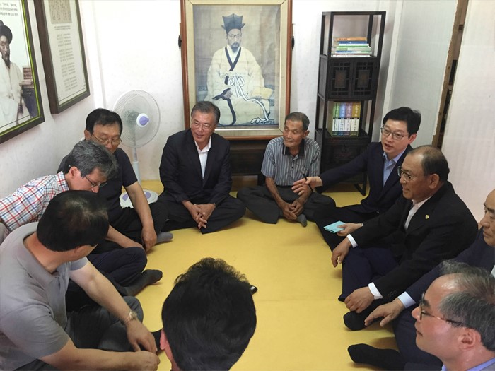 (서울=포커스뉴스) 문재인 더불어민주당 전 대표가 7일 오전 전남 광양 봉강면 매천 황현 선생 생가를 방문해 관계자들과 대화하고 있다. <사진제공=문재인 전 대표측>