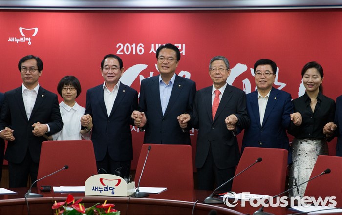 (서울=포커스뉴스) 김희옥(오른쪽 세번째) 새누리당 혁신비상대책위원장과 정진석 원내대표, 김광림 정책위원장을 비롯한 비대위원들이 8일 오전 서울 여의도 새누리당사에서 열린 마지막 혁신비상대책위원회 전체회의에서 포즈를 취하고 있다.