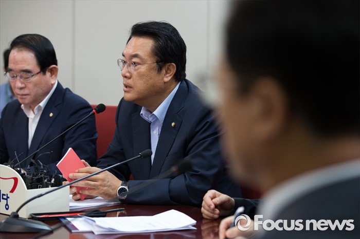 (서울=포커스뉴스) 정진석 새누리당 원내대표가 8일 오전 서울 여의도 새누리당사에서 열린 마지막 혁신비상대책위원회의에 참석해 오늘 사드 관련 중국을 방문한 더불어민주당 의원들에 대해 발언하고 있다.