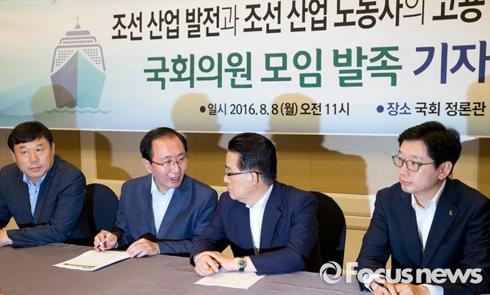 (서울=포커스뉴스) 8일 오전 서울 여의도 국회 귀빈식당에서 열린 조선 산업 발전과 조선 산업 노동자의 고용 안정을 위한 국회의원 모임 발족 기자회견에 참석한 박지원 국민의당 비상대책위원장과 노회찬 정의당 원내대표가 대화하고 있다. 왼쪽부터 김종훈 무소속 의원, 노 원내대표, 박 비대위원장, 김경수 더불어민주당 의원.