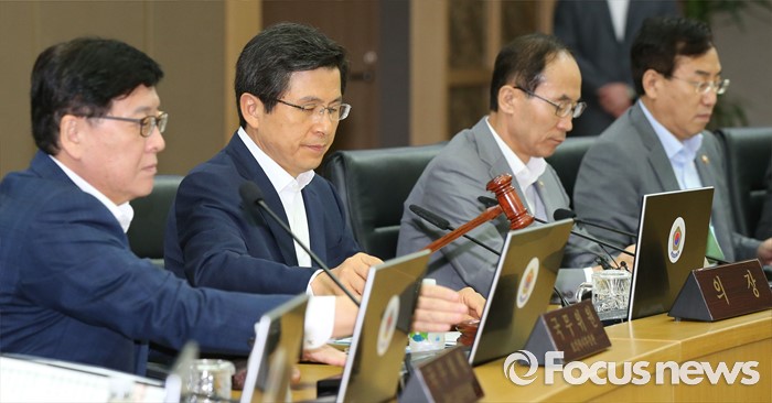 (세종=포커스뉴스) 황교안(왼쪽 두 번째) 국무총리가 9일 오전 세종시 정부세종청사 국무회의장에서 서울-세종 영상회의로 열린 국무회의에서 회의 시작을 알리는 의사봉을 두드리고 있다.