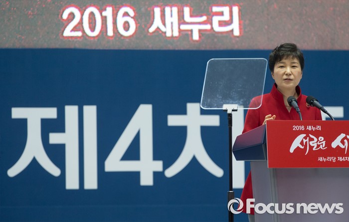 (서울=포커스뉴스) 박근혜 대통령이 9일 오후 서울 송파구 잠실실내체육관에서 열린 새누리당 4차 전당대회에 참석해 축사를 하고 있다.